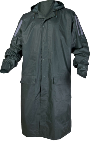 Płaszcz przeciwdeszczowy. Szwy uszczelnione. Kaptur stały. Zapinanie na kryty zamek błyskawiczny pod listwą na zatrzaski. Gumka wewnątrz nadgarstków. 2 kieszenie. Tkanina: poliester powlekany PVC.
